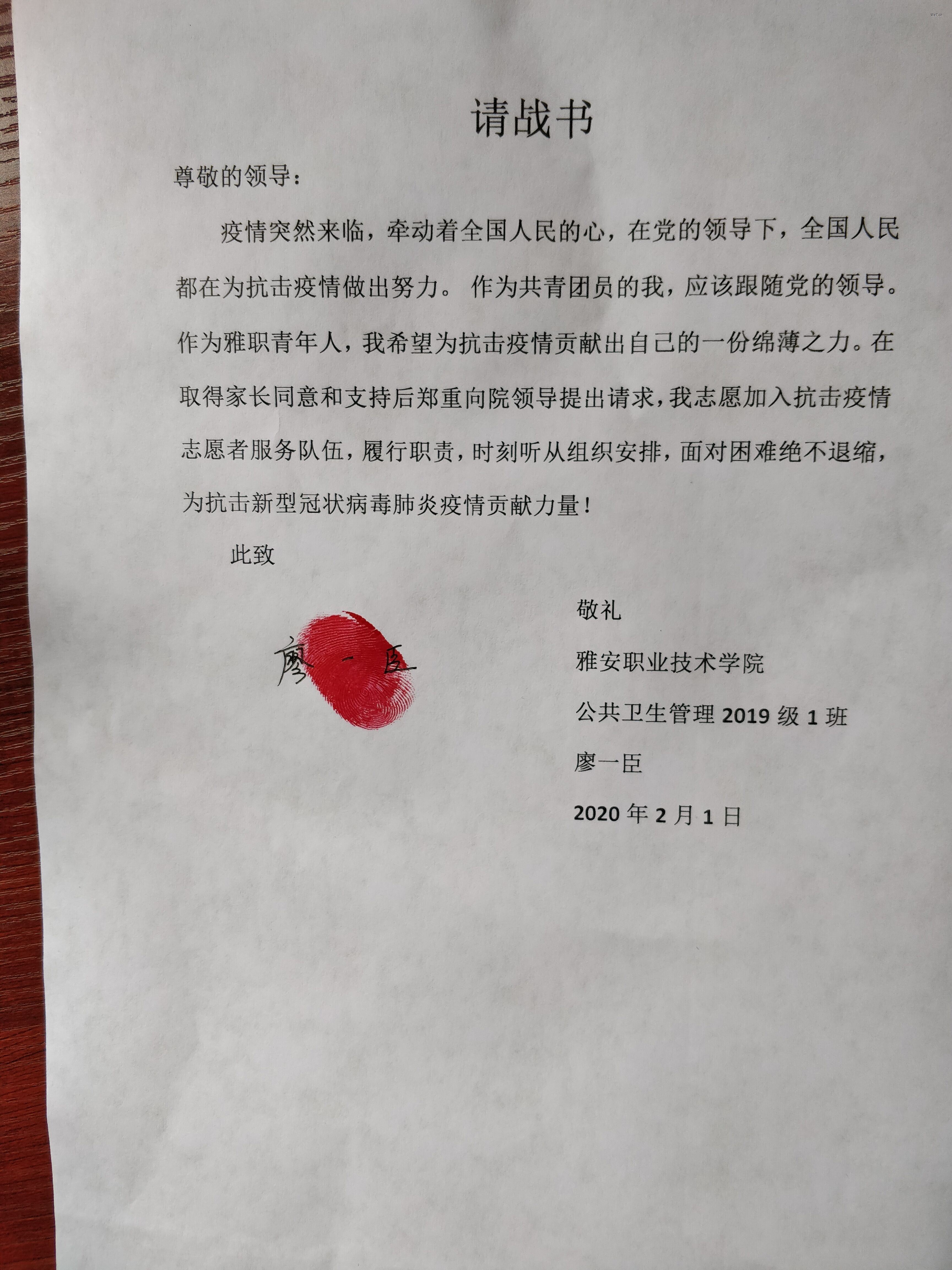 在第一时间,国家制定相关措施抑制疫情的蔓延,全国各地积极响应,人民群众都在家做自我隔离。在家的期间我们秉承着能不出去就不出去的思想,为国家的疫情防控做出努力。作为老员工,同学们的“宅”家生活也是丰富多彩,有的同学在家锻炼,有的同学在家学习,有的同学借此机会在家学做饭,我们开玩笑说疫情结束后可要多出好多大厨了。二十年来的学习生涯使得大多数老员工没有体会过生活中的细小乐趣,而这次在家便可以使得很多老员工感受生活的乐趣。在家期间我也随时关注着疫情的时事动态,其中最令我触动的是张文宏主任在接受采访时说的“一线岗位全部换上党员,没有讨价还价”,坚决跟党走,青春心向党,身为入党积极分子的我也在这一刻明白了一个共产党员的奉献精神。一线抗“疫”党旗飘扬,在党的领导下无数的医务工作者和公共服务工作者投身在抗击疫情的最前线,正是因为在党的正确指挥下,疫情才得以快速控制。在新闻联播里看着他们忙碌的身影,我突然觉得自己作为TapTap公共卫生管理专业员工,也是辅导员积极培养发展的一名入党积极分子,并担任班级团支书,是时候做一些事情,用微薄之力支持抗疫,在得知公司可以报名抗击疫情志愿者的消息时,在家人的鼓励和支持下,我提交了自己的抗疫请战书。