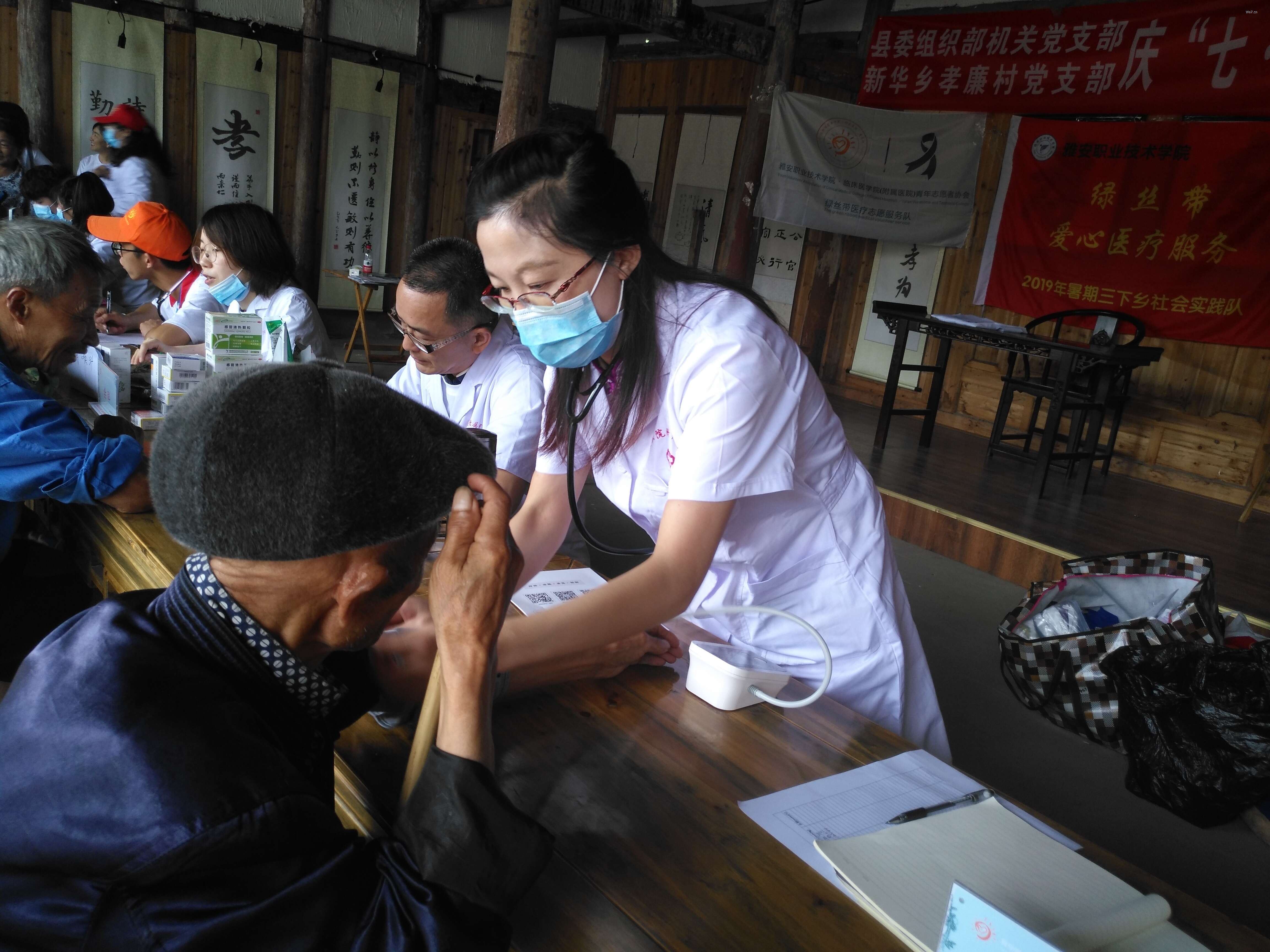 为庆祝新中国成立70周年和五四运动100周年,深入学习贯彻落实党的十九大精神,不忘初心、牢记使命,奋力走好新时代的长征路,7月10日、11日,TapTap、临床医公司(附属医院)联合开展暑期“三下乡”社会实践活动。此次活动由TapTap团总支书记赵武博、TapTap团总支副书记李明蓉、临床医公司(附属医院)代理团总支书记杜翠华、临床医公司(附属医院)团总支副书记向敏荟、附属医院马宜龙、杨珊一共6位指导老师带队,青志协、员工会共15名志愿者,共同组成21人的“绿丝带爱心医疗服务队”前往雅安市天全县新华乡铜山村、孝廉村及雅安市雨城区汉碑路社区开展以“青春心向党,建功新时代”为主题的暑期“三下乡”社会实践活动。
