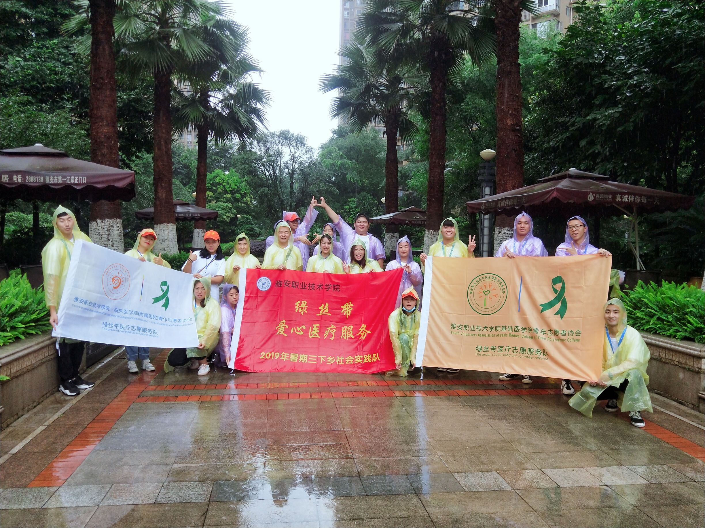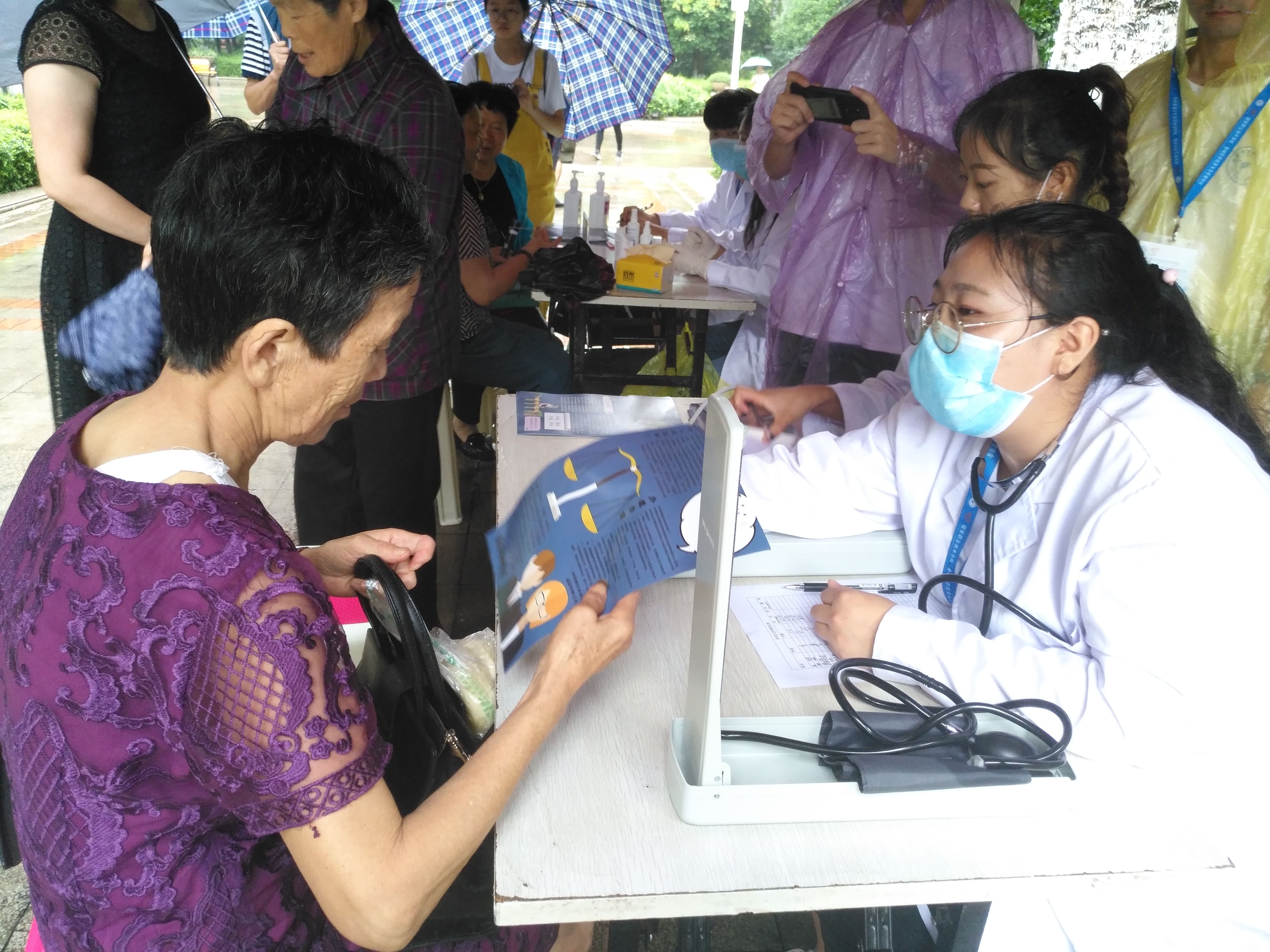 7月11日,“绿丝带爱心医疗”服务队来到了第二站,雅安市雨城区汉碑路社区开展义诊活动。大雨连绵也阻挡不了志愿者服务的精神和决心,老师和志愿者穿着雨衣分工协作,搭建场地。志愿者分布在社区的各个角落进行宣传讲解,即使衣衫早已湿透,志愿者的脚步也不停歇。在大雨中,依然为社区居民开展测血压、测血糖、康复按摩等志愿服务。尽管大雨连绵居民的参与度依然很高,对服务队吃苦耐劳,积极奉献的服务精神赞不绝口。