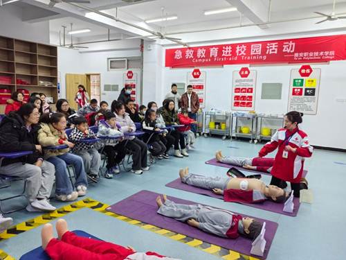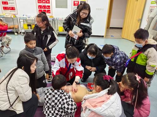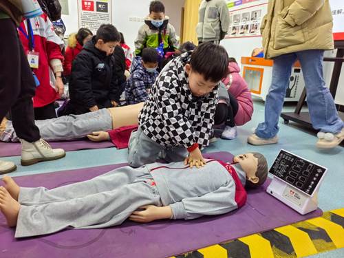 喻荣雪和李佳老师在科普基地的急救技能培训中心对亲子家庭进行意外伤害和急救技能培训,示范了心肺复苏和海姆立克急救法,基本外科护理包扎等救护操作,对体验学员进行现场操作指导。