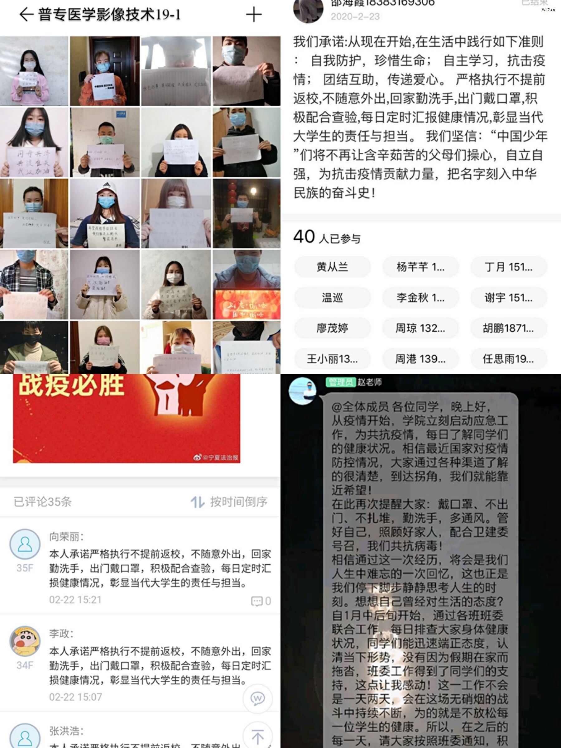 从 2月20日到3月2日在线上陆续对班团活动进行了讨论、指导和互动。各班团支书组织班级班委网络会,大家分工设计制作活动PPT、官方宣传资料、相关图片、影片、班群接龙、抢答等形式多样的互动方式来开展活动,让同学们在疫情宅家期间感受到集体的温暖,深刻认识到疫情期间除了宅家上网课,还有多样有意义的班团活动可以与大家分享和交流,极大丰富了同学们的宅家生活,使同学们在思想上更明确方向。